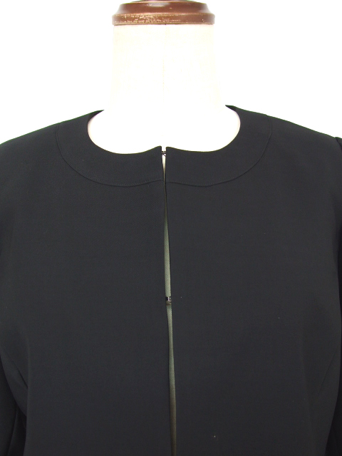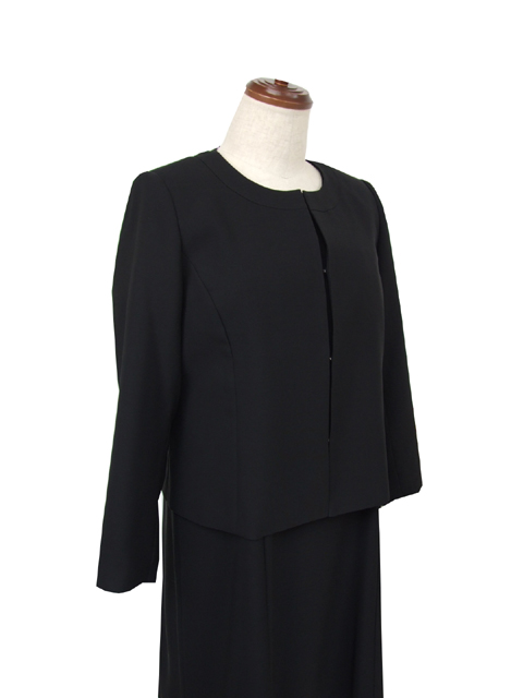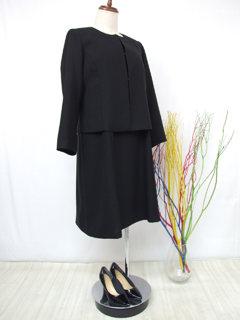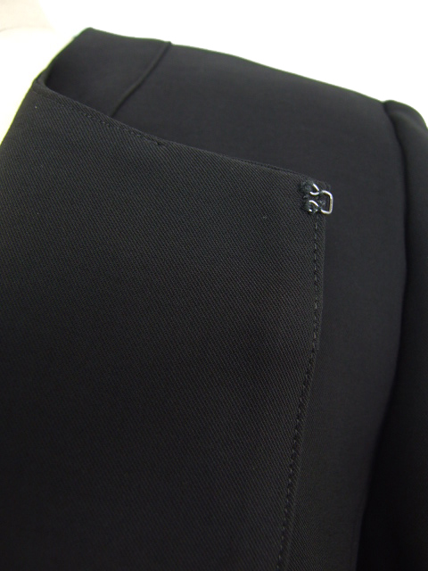 ジャケットは総裏地付き、前フック4つ。ワンピースは身頃身のみ裏地付き、左胸ファスナー使い。