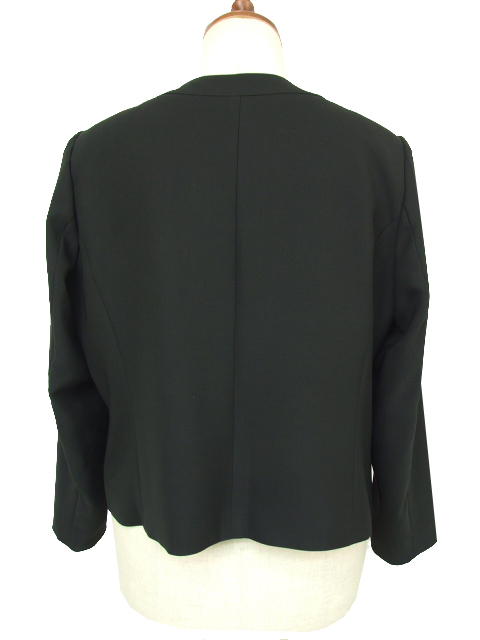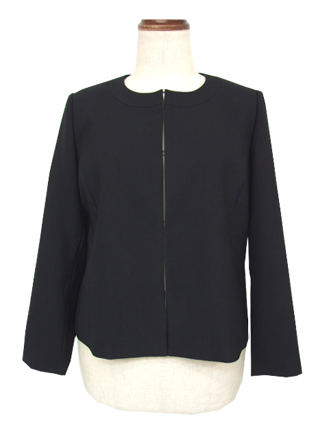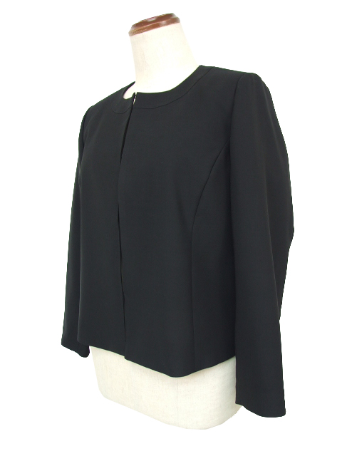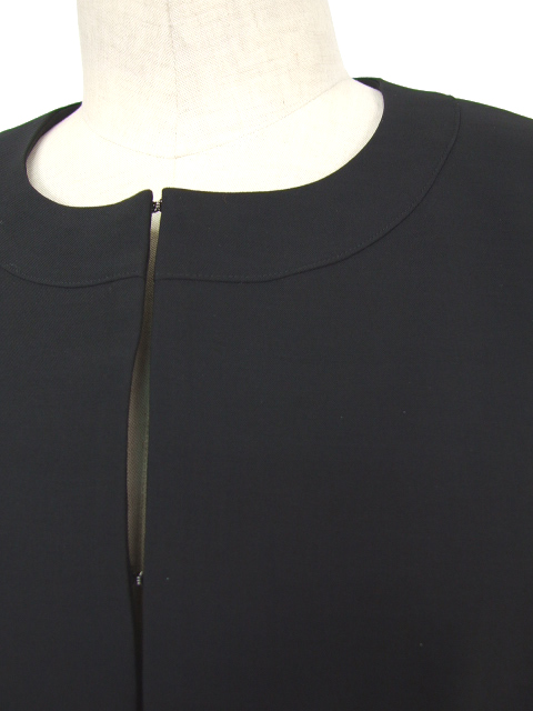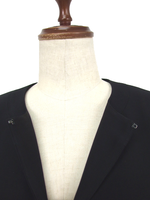 ノーカラーのジャケットのフロント部分は内側のフック留めタイプで、もたつきのないスマート感があり、総裏仕立てでしっかりした作りになっています。