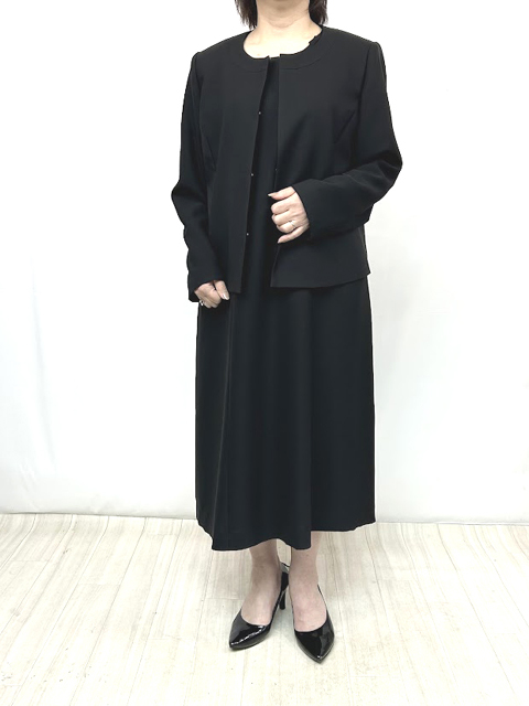 季節に応じた着こなしができる、ノーカラージャケットと7分袖ワンピースのアンサンブル。