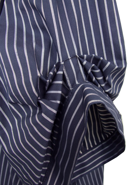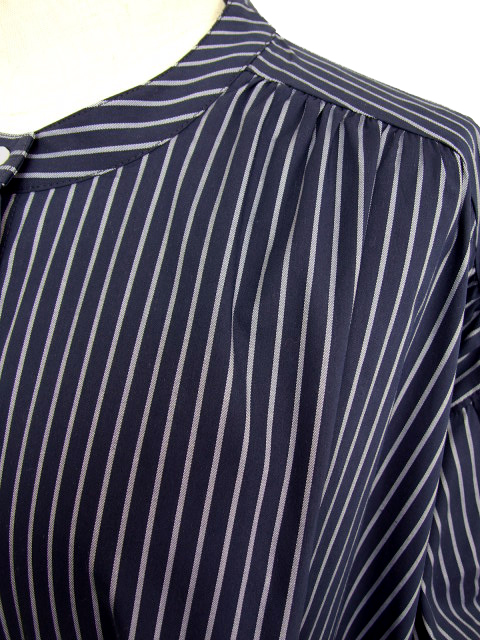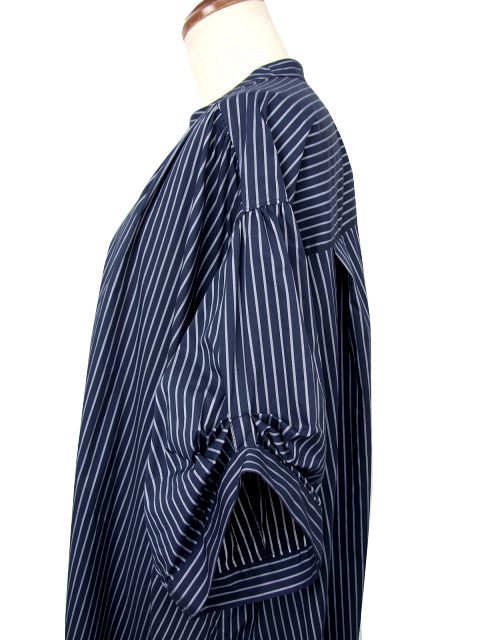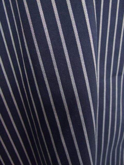 肩を落として着るゆったりしたカタチは、体のラインをしっかりカバーし、それでいて、ストライプ柄ですっきり見える仕掛け◎