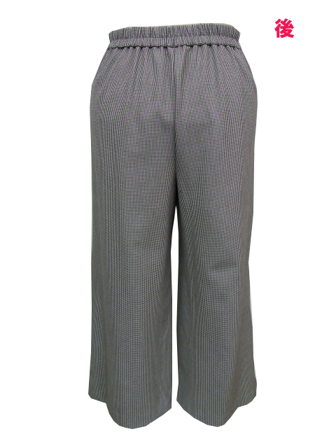 後ウエストは3.5cm幅のゴムギャザーでお腹への負担が少なく、前はウエストインもサマになるタック使いデザイン。