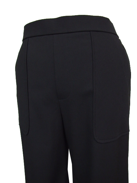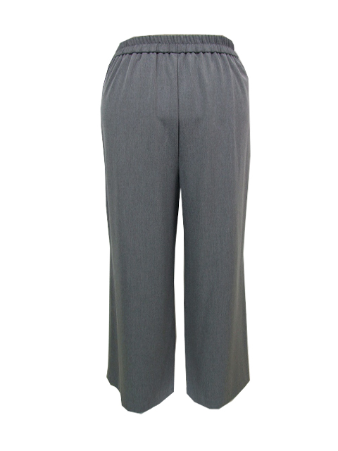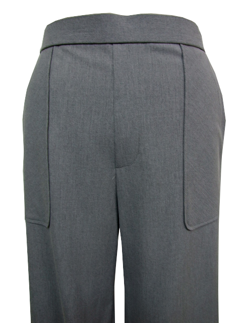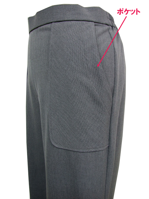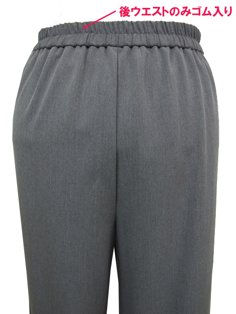 後ウエストは3.5cm幅のゴムギャザーでお腹への負担が少なく、前はウエストインもサマになるタック使いデザイン。