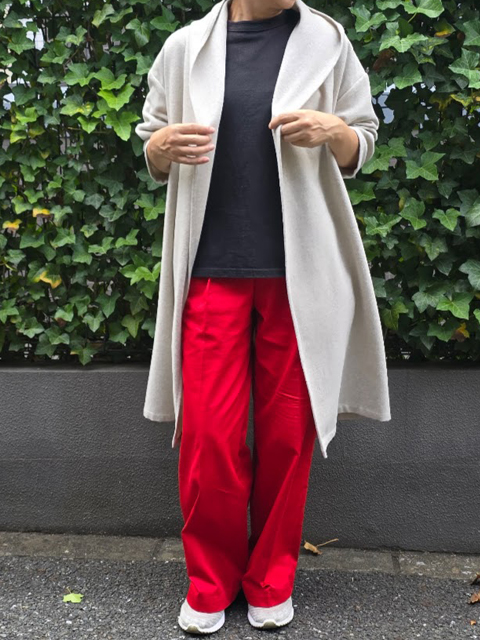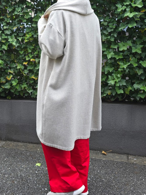 カタチはサラリと着流すボタンなしのIラインシルエットで、長め丈でどんなボトムとも合わせやすいのも魅力です。