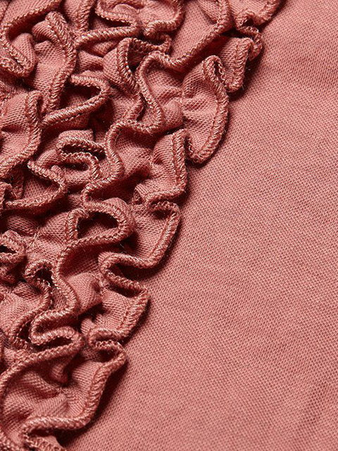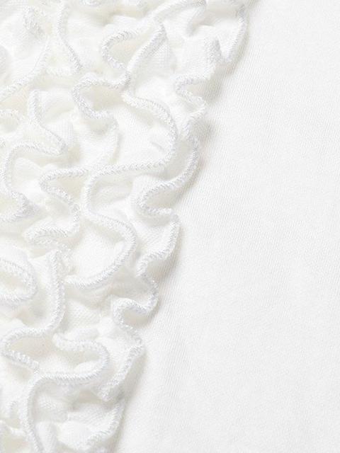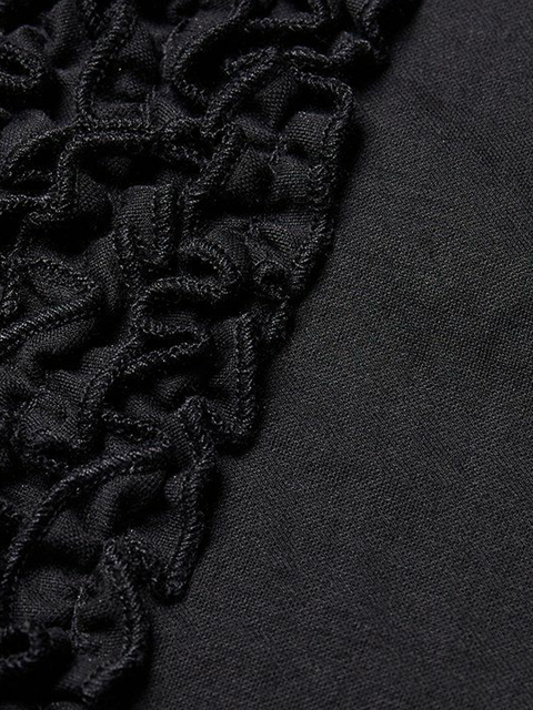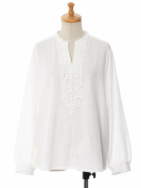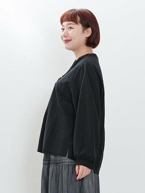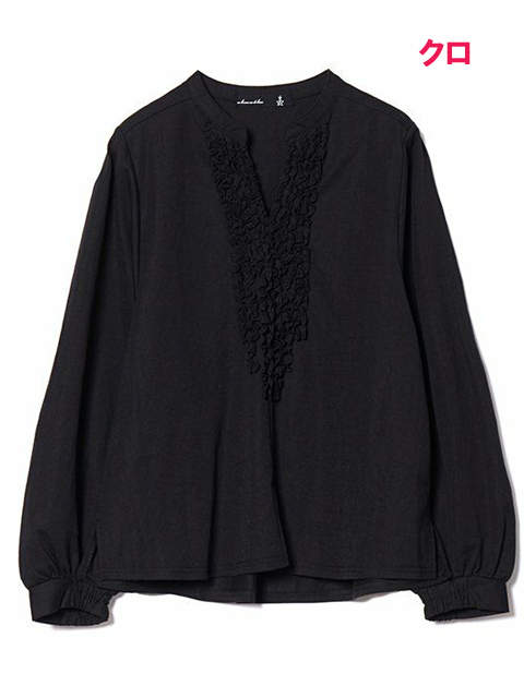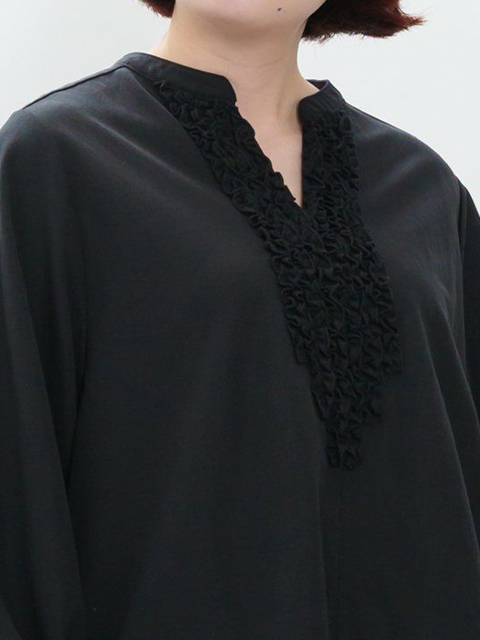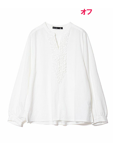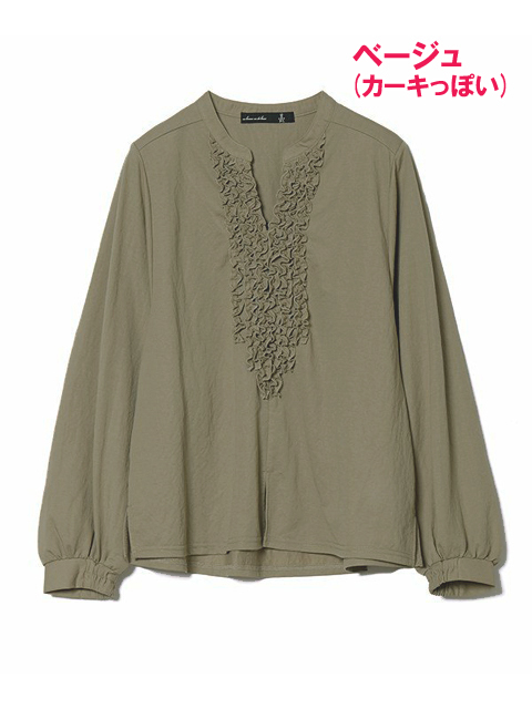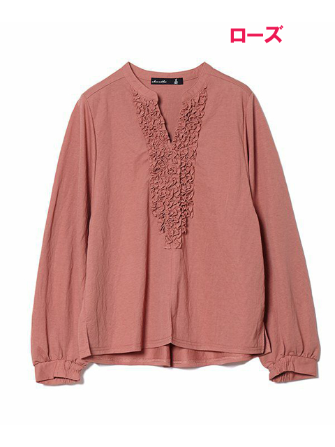 胸元のフリルが女性らしい華やぎを添えるブラウス。