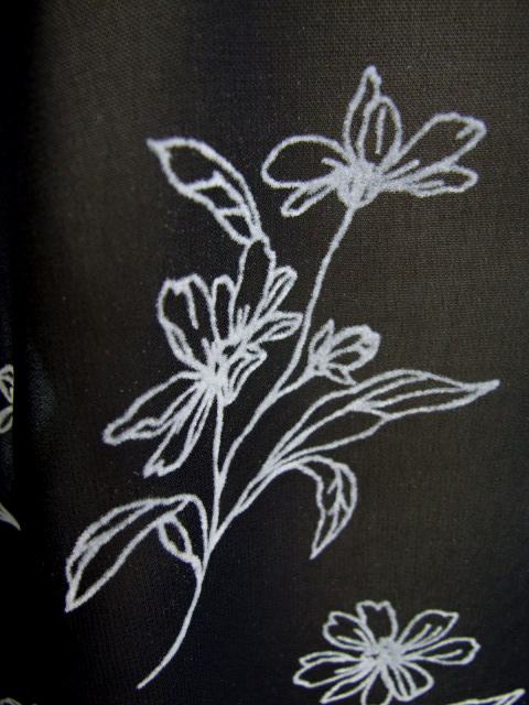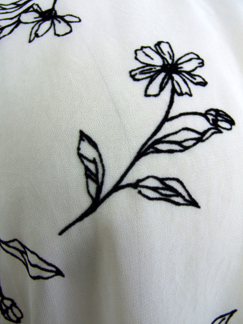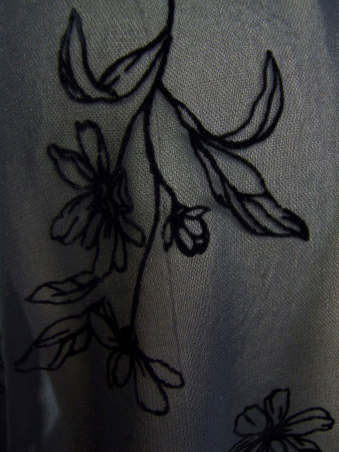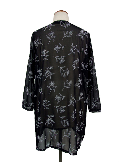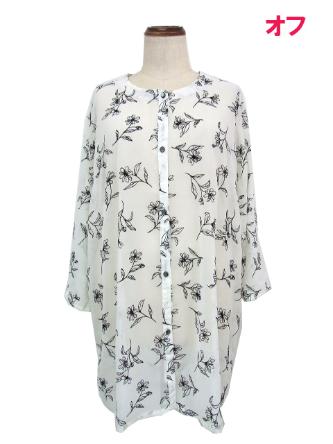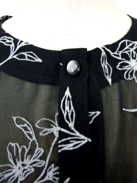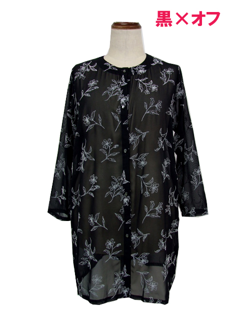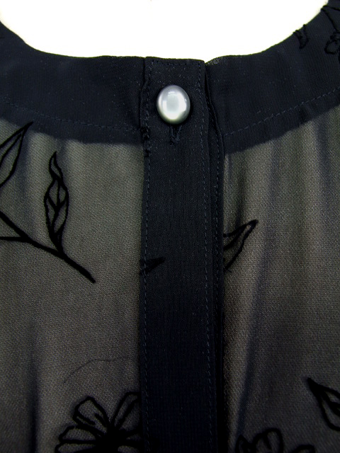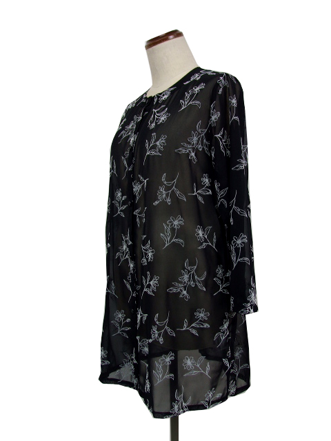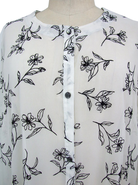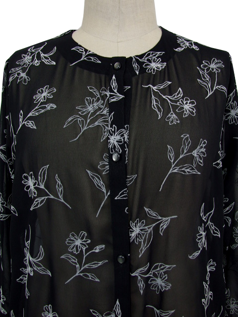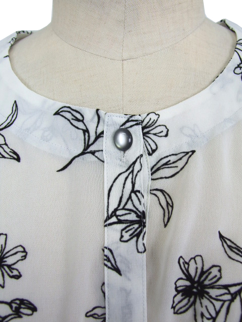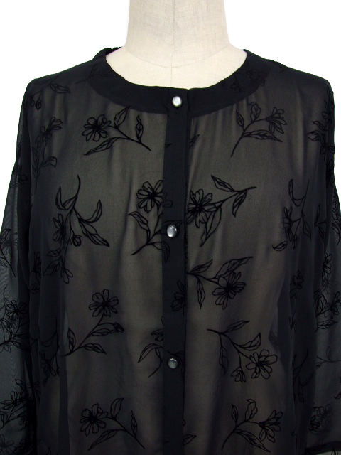 シアーな身生地に浮かぶフロッキー花プリントが品のいい見栄えを発揮し、普段にもお出かけにも使える活用度の高い一枚に仕上がりました。