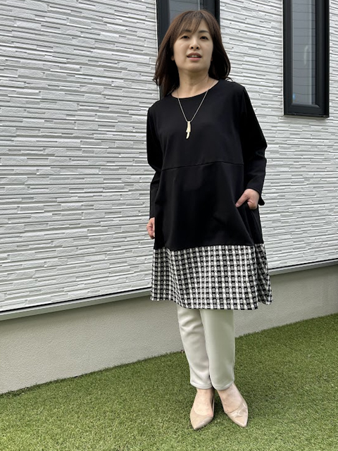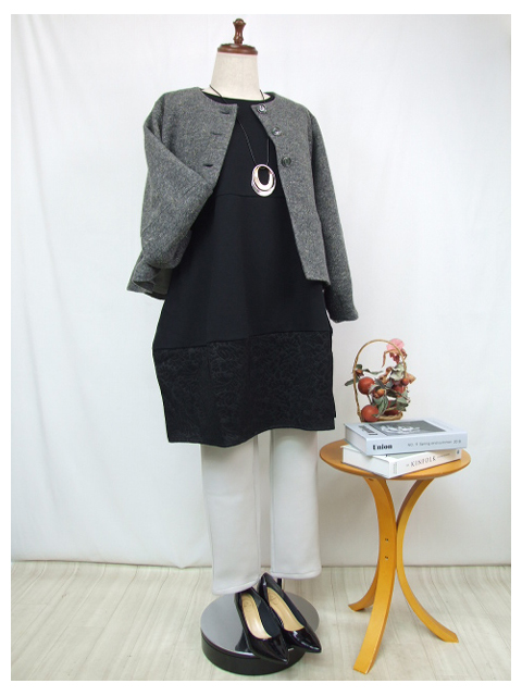 品のいい黒モールと白黒チェックのジャガードは、黒に映えて派手にならず、デニムやカラーパンツでアクティブに、モノトーンパンツでモードにいろんな雰囲気が楽しめます。