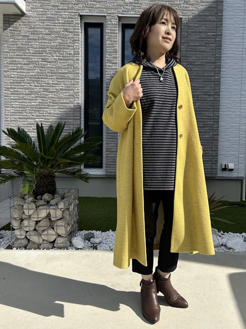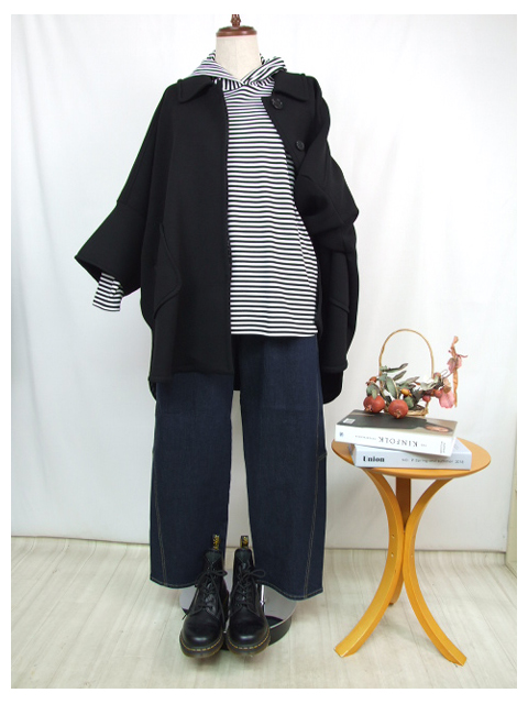 カタチはドロップショルダーにややゆとりのあるボックス型で、体のラインをカバーし、さっくり着こなしていただけます。