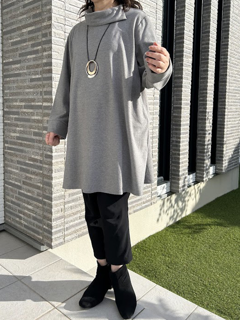 全体的にシンプルな分、視線はロールネックへ注がれ、トップに重心を上げてバランスのいい仕上がりに。