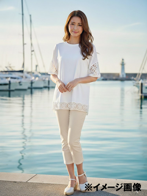 Tシャツ感覚でラクに着れるのに、そこにシアー感をプラスするだけで驚くほど涼感が上がり、グッとエレガントな一枚になりました。