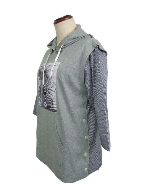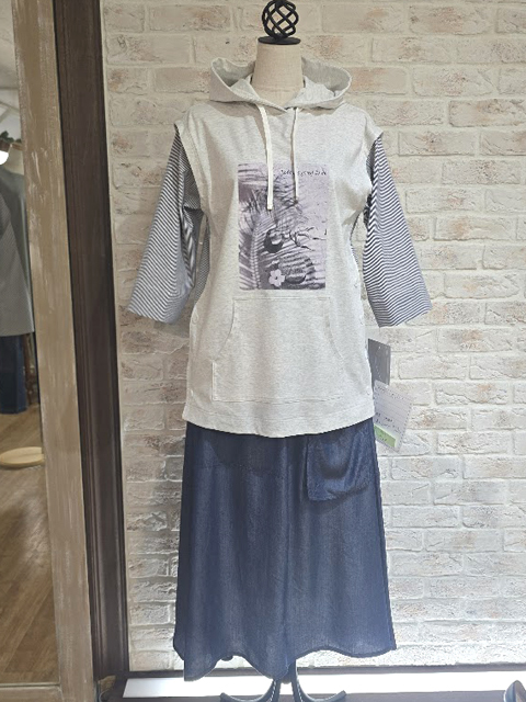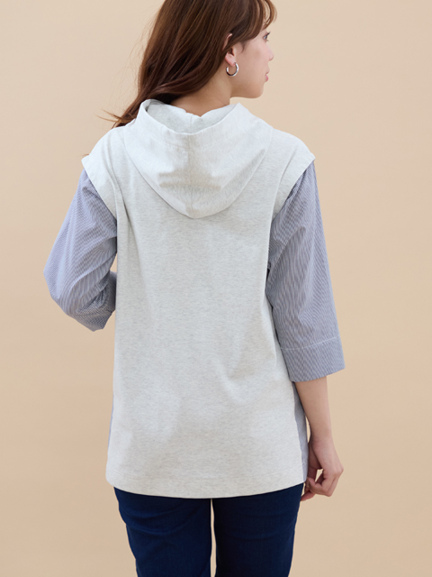 シャツにベストをレイヤードしたようなデザインで、丁度良い可愛さと程よいラフ感が簡単に出せるパーカーです。