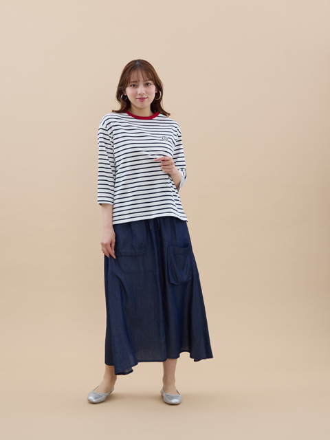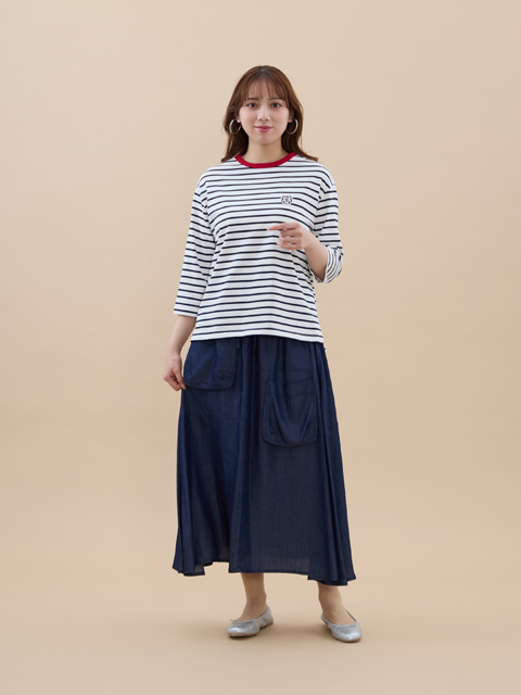 ゆとりのあるボックス型で、体のラインをすっぽり包み、ボトムにインしてもアウトにしてもOKな腰丈で、ワイドパンツやスカートとも相性は◎